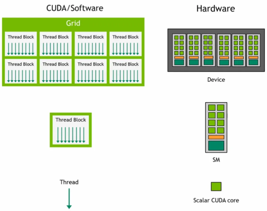 - Individual threads execute on scalar CUDA cores